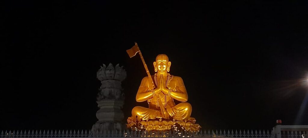 The lotus is placed on the elephant from all sides. These elephants are also fountains as water was coming out of their mouth. From the top, the vicinity was dark. So, the immensely lit statue was looking wow amidst that darkness. Below is a big circular hall in which a gold statue of the saint is placed for worship. The pujari there puts a bell-shaped mala on the head of devotees and chants Srimannarayan in blessings.