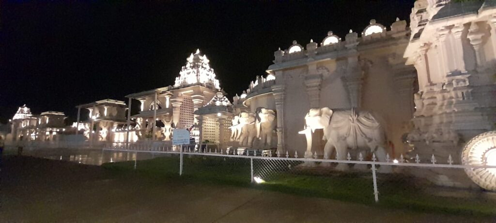 We descended, and from there we started to visit 108 Divya Desams (model temples) that surround the area around the statue. These are 108 replicas of ancient Vishnu temples, which are significant in Vaishnavism. Divya means “divine” and Desam means “place of abode” (temple). Dark black stone temples looked heavenly at those hours of the night.